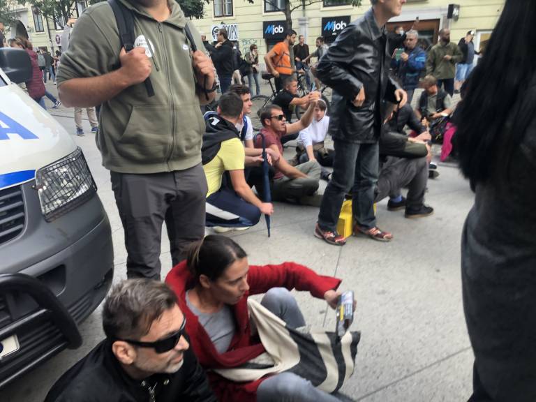 16.54 - Protestniki so obkolili policijski kombi in ga začeli tresti. Raperja Zlatkota so priprli policisti.