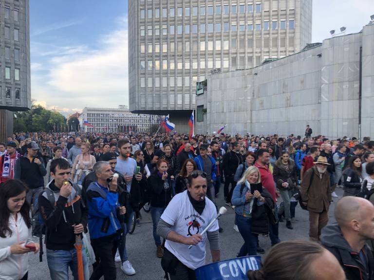 17.36 - Protestniki so se začeli premikati s trga. Hodijo po Aškerčevi ulici, vzklikajo »Maske dol!«, vrgli so pa tudi petardo.