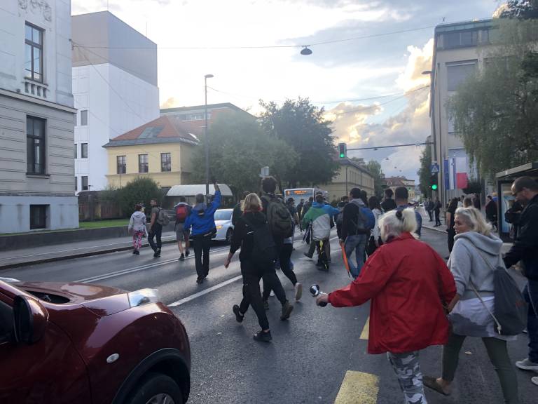 16.38 - Protestniki se premikajo proti Čopovi ulici in ob tem v megafon vzklikajo »Shizofrenik Janez, odstopi danes Janez, odstopi danes Janez.«