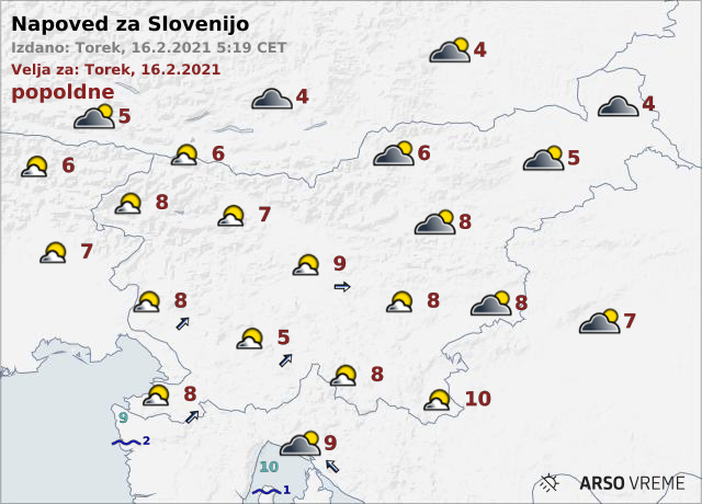 Po napovedi državnih meteorologov bo danes na zahodu večinoma sončno, drugod zmerno do pretežno oblačno, več oblačnosti bo na severovzhodu. Čez dan bo ponekod zapihal šibak jugozahodni veter. Najvišje dnevne temperature bodo od 4 do 10 stopinj Celzija.