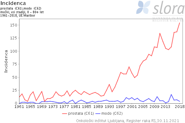 Zadnji dostopni podatki so na voljo za obdobje od leta 1961 do leta 2018. Tako, če si ogledamo podatke le za Maribor, lahko vidimo, da je število primerov raka prostate na območju upravne enote Maribor začelo intenzivno naraščati po letu 1992. Leta 1992, v primerjavi z letom poprej, smo potrdili deset primerov raka prostate več kot v letu 1991, in sicer 25. Nato pa kot že rečeno, število začne intenzivno naraščati.