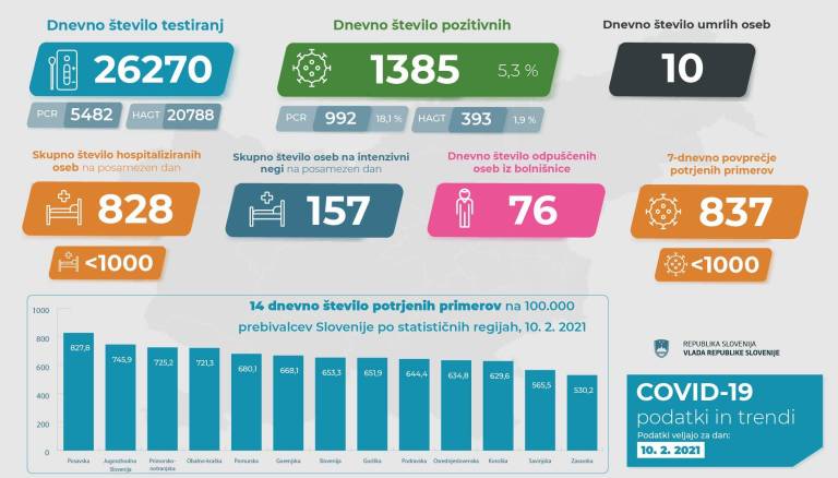 V Sloveniji so včeraj, 10. februarja, opravili 26.270 testiranj na koronavirus in potrdili 1385 novih okužb, gre za 5,3-odstotni delež okužb.