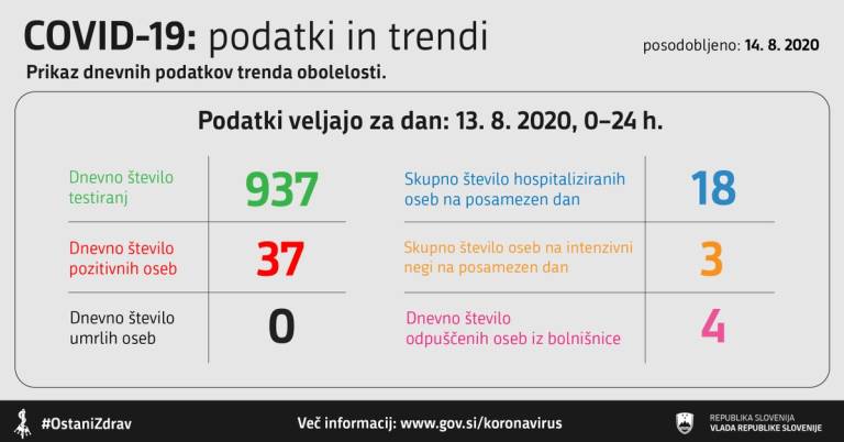 Včeraj, 13. avgusta 2020, so v Sloveniji opravili 937 testiranj na okužbo s koronavirusom. Pri tem so potrdili 37 novih okužb. Za primerjavo, dan pred tem je bilo ob 856 testiranjih 29 pozitivnih primerov.