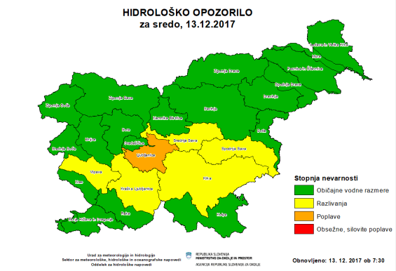 Po podatkih Agencije Republike Slovenije za okolje naraščajo Krka s pritoki v srednjem in spodnjem toku ter Unica. Pretok Ljubljanice je ustaljen, polnijo pa se kraška polja. Sava je tudi v spodnjem toku že začela upadati.