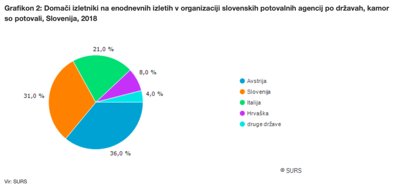 Enodnevnih izletov v organizaciji slovenskih potovalnih agencij se je v letu 2018 udeležilo skupaj 336.000 domačih izletnikov; 104.000 teh izletnikov se je udeležilo enodnevnih izletov po Sloveniji 231.000 pa enodnevnih izletov v tujino (od teh jih je največ potovalo v Italijo; sledili sta Hrvaška, Avstrija), kažejo podatki Statističnega urada Republike Slovenije.