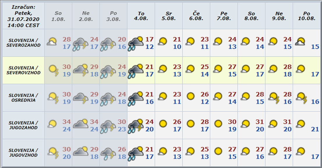 V nedeljo bo deloma sončno, verjetnost neviht bo sprva majhna, popoldne pa bo naraščala. Najnižje jutranje temperature bodo od 16 do 20, na Primorskem do 23, najvišje dnevne od 26 do 30, na Primorskem do 34 stopinj.