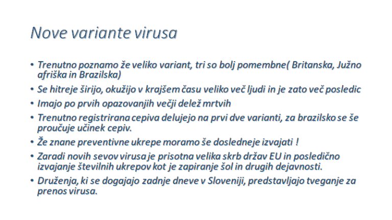 »Če bi razmere ostale enake, bi se ob upoštevanju veljavnih ukrepov epidemija izpela junija. Ob poslabšanju razmer bi se epidemija podaljšala. Stanje v Evropi je alarmantno, cela Evropa se boji angleškega seva, v sosednji Avstriji so že odkrili tudi južnoafriški sev. Če se bodo ti sevi močno širili, lahko pride do hudega tretjega vala,« je jasen Krek.