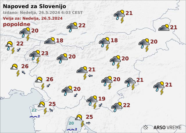 V ponedeljek bo dokaj sončno, čez dan bo nastalo nekaj spremenljive oblačnosti. V zahodni Sloveniji bo možna kakšna kratkotrajna ploha ali nevihta. Najvišje temperature bodo od 21 do 26 stopinj Celzija.
