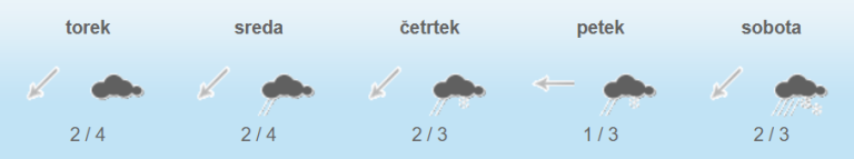 V četrtek in petek bo oblačno. V notranjosti Slovenije bodo občasno rahle padavine, po nižinah deloma dež, deloma sneg. Na Primorskem bo še pihala zmerna burja.