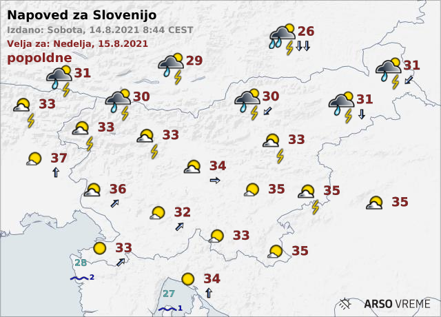 Danes je tako napovedano jasno vreme, jutranje temperature so bile od 14 do 20, ob morju okoli 22. Najvišje dnevne temperature bodo od 30 do 34, na Goriškem do 36 stopinj Celzija.