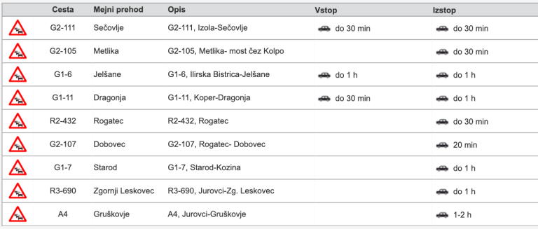 Čakalna doba je na mejnih prehodih Sečovlje, Dragonja, Starod, Jelšane, Metlika, Rogatec, Dobovec, Gruškovje in Zgornji Leskovec, so še opozorili na spletni strani Prometno-informacijskega centra za državne ceste.