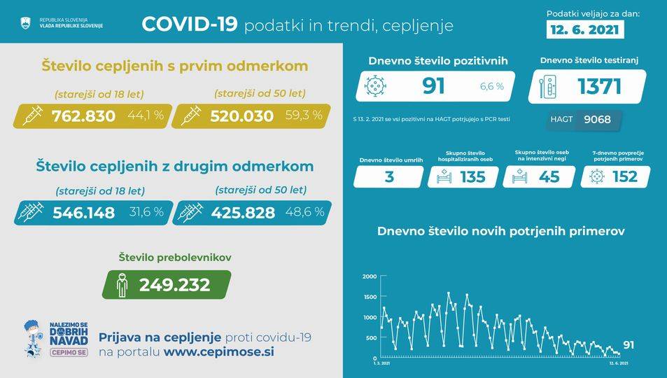 V Sloveniji so včeraj, 12. junija, opravili 1371 PCR testiranj na koronavirus in potrdili 91 novih okužb, gre za 6,6-odstotni delež okužb.