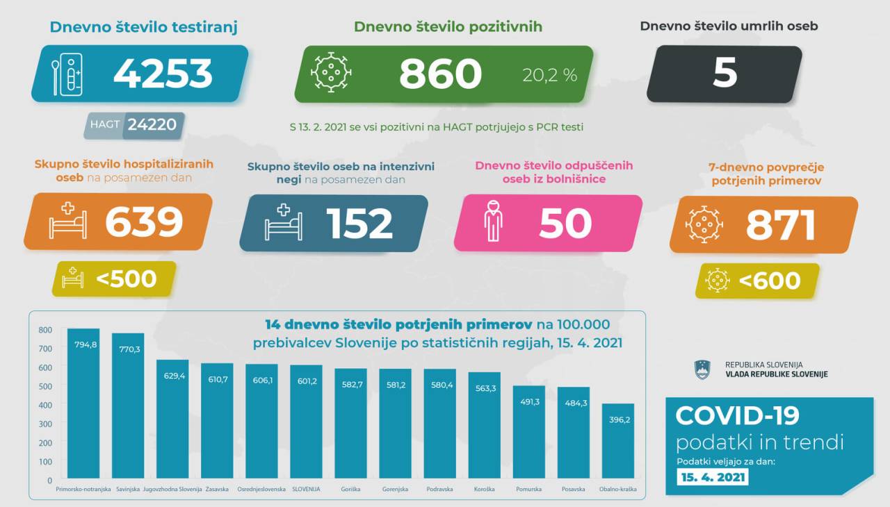 V Sloveniji so včeraj, 15. aprila, opravili 4253 PCR testiranj na koronavirus in potrdili 860 novih okužb, gre za 20,2-odstotni delež okužb.