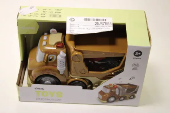 Pri igrači Avto dinozaver 672BS MLC One Sinsay je embalaža izdelana iz nepropustne plastične vrečke, katere izmerjena debelina je prenizka in lahko predstavlja tveganje zadušitve. Vijaki, ki služijo za pritrjevanje pokrova predala za baterije, se ne zadržijo na pokrovu, temveč se med uporabo ločijo.