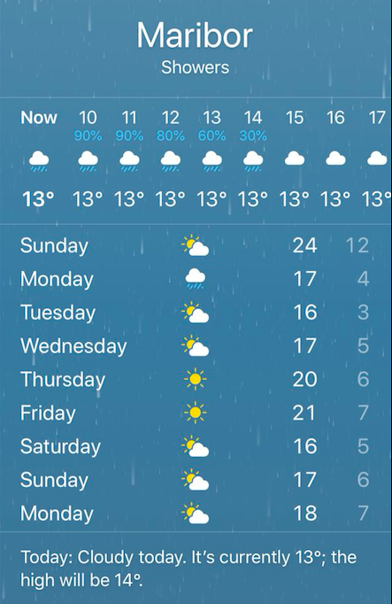 Tudi jutri se nam obeta zmerno do pretežno oblačno vreme. Burja na Primorskem se bo polegla. Najnižje jutranje temperature se bodo gibale med 7 in 12, najvišje dnevne med 18 in 22, na Primorskem in na vzhodu pa tudi 24 stopinj Celzija.