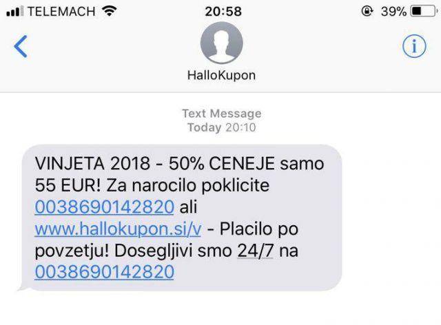 Ponudba s strani Hallo Kupon je v januarju kar deževala na mobilnike slovenskih državljanov. Sporočilo je uporabnike vabilo k naročilu vinjete po polovični ceni. Naročilo naj bi izvedli s klicem na premijsko telefonsko številko 0038690142820 ali preko obiska spletne strani www.hallokupon.si/v.