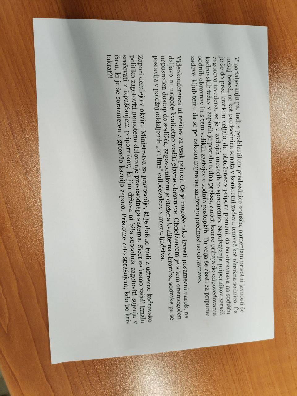 V protestnem pismu je med drugim zapisala: »Neprivajanje pripornikov zaradi kadrovskih težav v zaporih je postalo redna praksa, zaradi katere prihaja do odpovedovanja sodnih obravnav in s tem velikih zastojev v sodnih postopkih.«