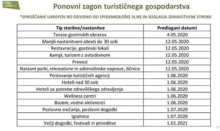 Kot kaže, bodo manjši nastanitveni obrati, ki sprejmejo do 30 oseb, restavracije in gostinski lokali, kampi, prevozi, naravni parki in žičnice začeli obratovati 12. maja. Turistične agencije, hoteli z več kot 30 sobami in hoteli za potrebe zdraviliškega zdravljenja, wellness centri in bazeni naj bi svoja vrata odprli 1. junija. Poslovna srečanja in igralnice pa naj bi svoja vrata odprla 1. julija.