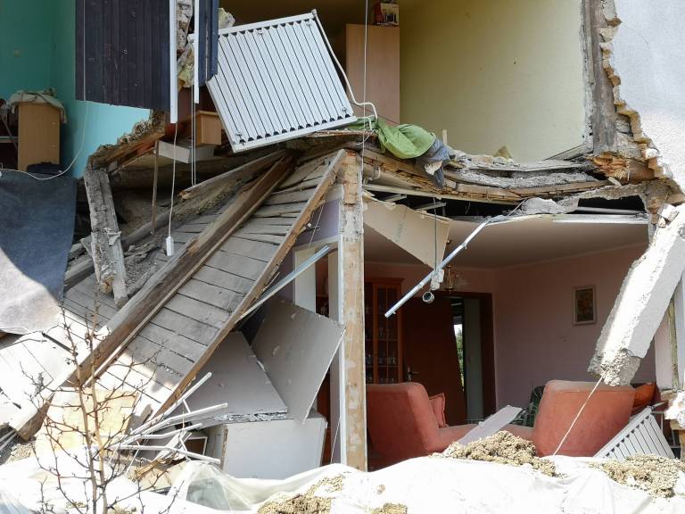 Iz prvega nadstropja zdaj visi radiator, med ruševinami leži likalna deska. Na postelji, kjer sta do usodnega dne spala s partnerico, danes leži stena.