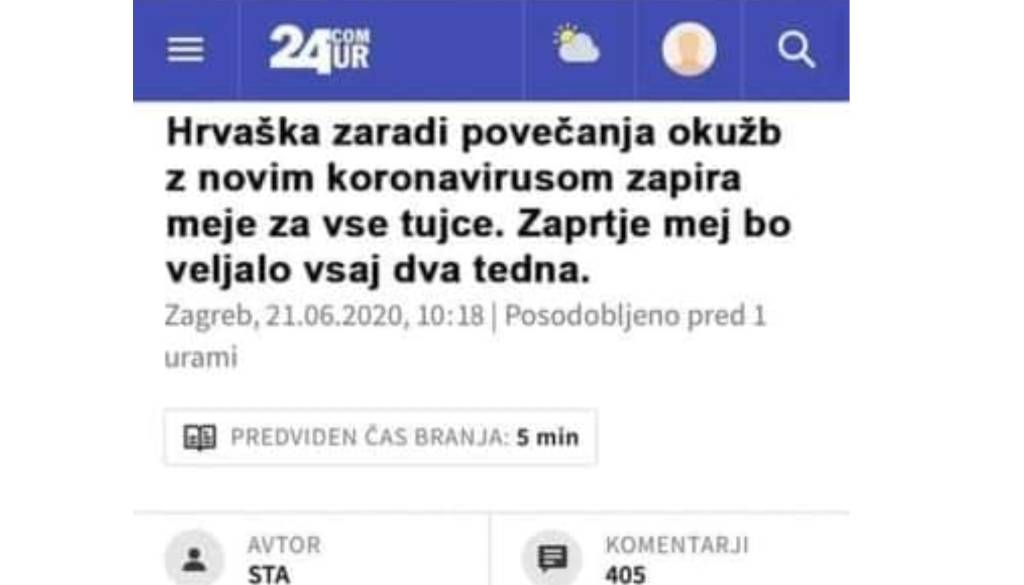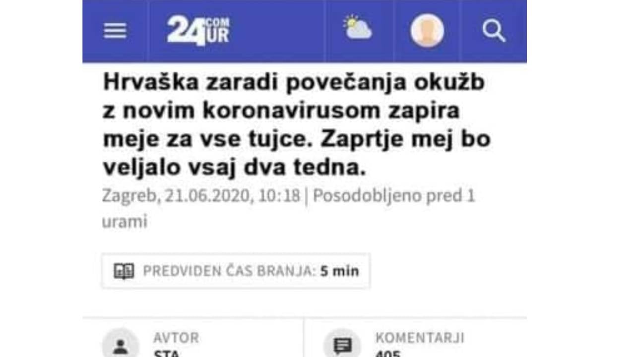 Ste na Facebooku naleteli na fotografijo članka, ki govori o zaprtju hrvaških mej? Članek daje videz objave na spletnem portalu 24ur.com, vendar tam te novice ni bilo objavljene.