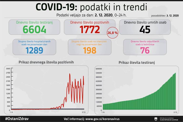 V Sloveniji so v včeraj, 2. decembra, opravili 6604 testiranj na koronavirus in potrdili 1772 novih okužb. To pomeni, da je bil delež pozitivnih testov tokrat 26,82 odstotka.