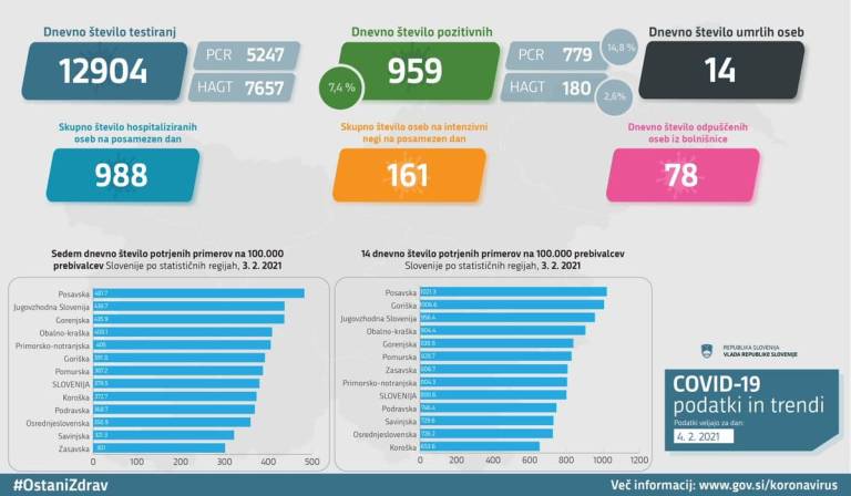 V Sloveniji so včeraj, 4. februarja, opravili 12.904 testiranj na koronavirus in potrdili 959 novih okužb, gre za 8,7-odstotni delež.