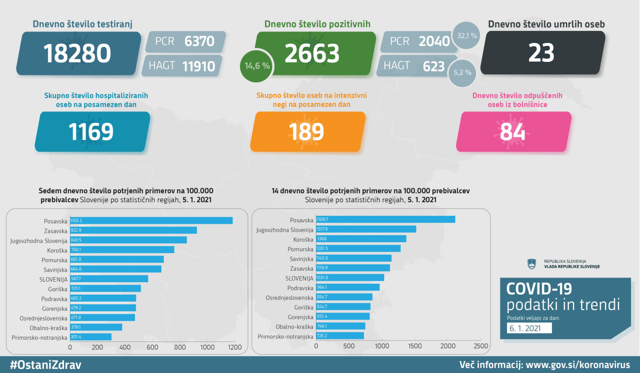 V Sloveniji so včeraj, 6. januarja, opravili 18.280 testiranj na koronavirus in potrdili 2663 novih okužb. To pomeni, da je bil delež pozitivnih testov tokrat 14,6-odstoten.