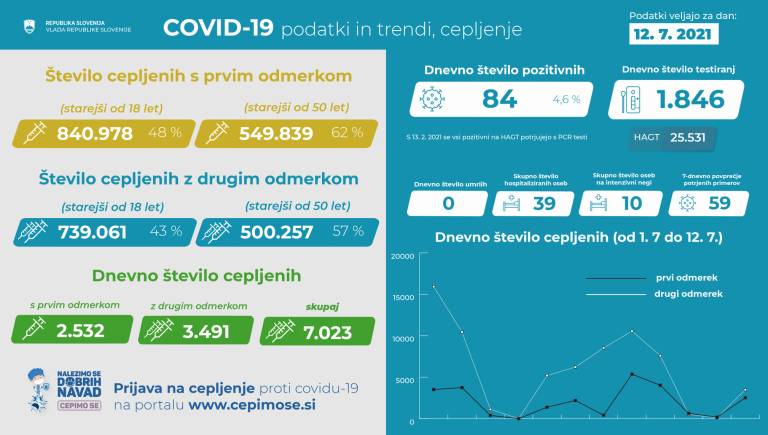 V Sloveniji so včeraj, 12. julija, opravili 1846 PCR testiranj na koronavirus in potrdili 84 novih okužb, gre za 4,6-odstotni delež okužb.