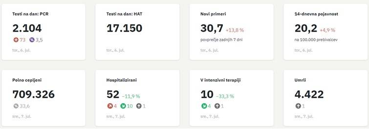 V Sloveniji so včeraj, 6. julija, opravili 2104 PCR testiranj na koronavirus in potrdili 73 novih okužb, gre za 3,5-odstotni delež okužb.
