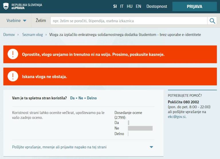 »Oddaja vloge je enostavna in zanjo ne potrebujejo e-identitete,« so zapisali na uradni strani ministrstva prejšnji teden. Tako enostavna, da vloga, preko katere bodo študenti zaprosili za denarni dodatek, v ponedeljek dopoldan še vedno ne deluje. Kljub temu da mora biti vloga oddana najkasneje do te srede, 22. aprila, če želijo študenti prejeti dodatek še v mesecu aprilu.