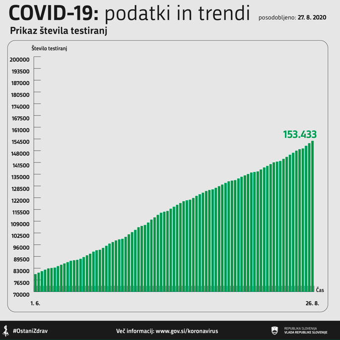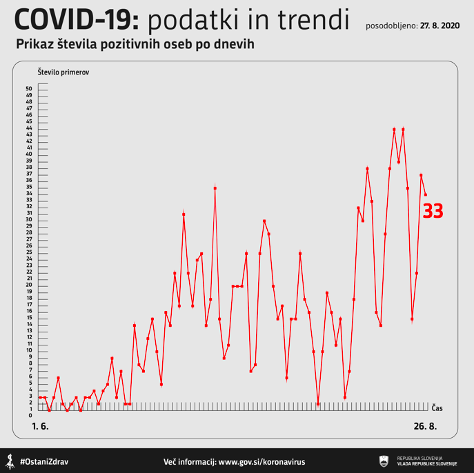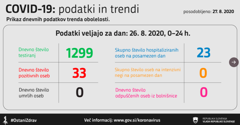 V Sloveniji so včeraj, 26. avgusta, opravili 1299 testiranj na novi koronavirus. Potrdili so 33 novih okužb.