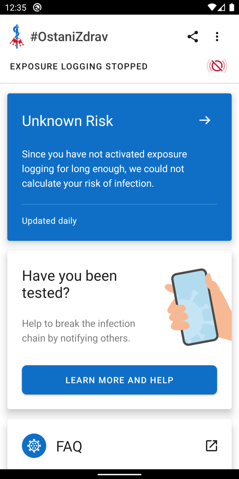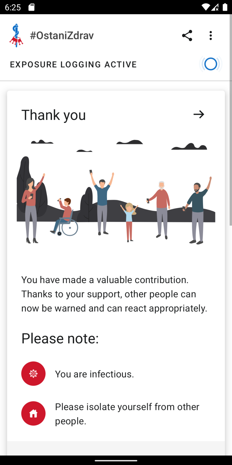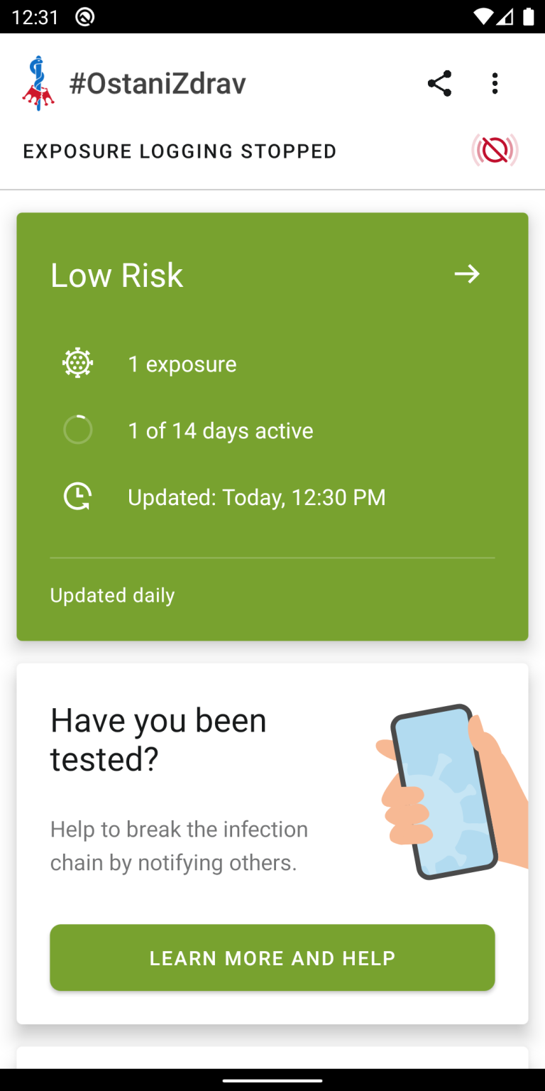 Mobilna aplikacija, ki bo obveščala uporabnike o stikih z okuženimi osebami, naj bi bila na voljo predvidoma v sredini avgusta na spletni trgovini App Store in Google Play. Uporaba aplikacije bo prostovoljna, po zagotovilih ministra za javno upravo Boštjana Koritnika, pa ne bo delovala na sistemu GPS in ne bo omogočala shranjevanja geolokacijskih podatkov.