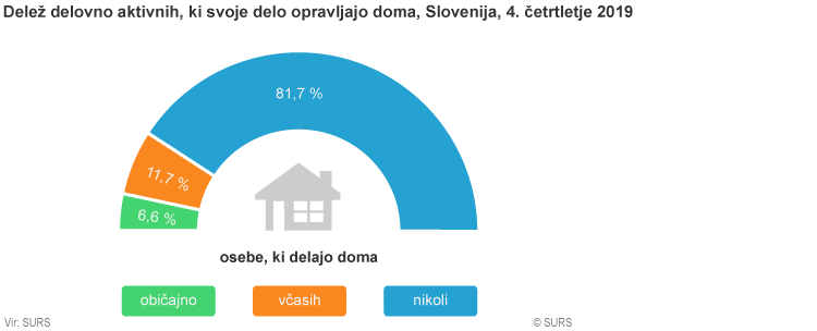 V četrtem četrtletju leta 2019 je svojo osnovno dejavnost, običajno ali včasih, opravljalo doma približno 179.000 delovno aktivnih oseb oziroma 18,3 odstotka posameznikov. Med razlogi za opravljanje dela doma sta bila največkrat navedena preobilica dela oziroma lastni interes in dogovor z delodajalcem.