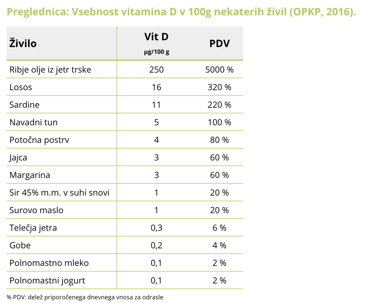 Veliko D vitamina lahko najdemo v določeni hrani: v ribah (losos, sardine, tuna, postrv), jajcih, v surovem maslu, siru, polnomastnem mleku in jogurtu. Priporočeni količini dnevnega vnosa vitamina D zadostimo, če na primer pojemo 31 gramov lososa, so še zapisali na Zdravstvenem portalu.