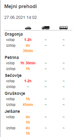 Na Gruškovju je čakalna doba eno uro za vstop in 45 minut za izstop. Na Sečovljah in Jelšanah vozniki čakajo pri vstopu v državo, in sicer po eno uro oz. 45 minut.