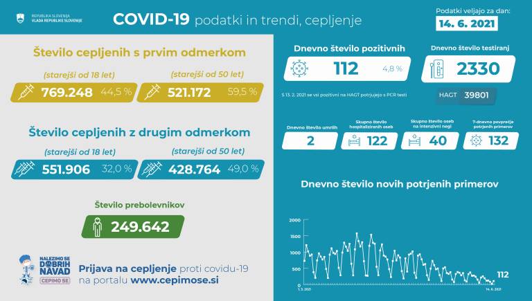 V Sloveniji so včeraj, 14. junija, opravili 2330 PCR testiranj na koronavirus in potrdili 112 novih okužb, gre za 4,8-odstotni delež okužb.