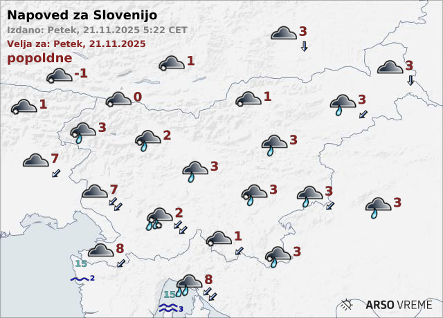 Povečini bo rahlo deževalo, ponekod v notranjosti tudi deloma snežilo, deloma deževalo. Na Primorskem bo pihala zmerna burja. Najvišje dnevne temperature bodo od nič do tri, na Goriškem in ob morju do seden stopinj Celzija.