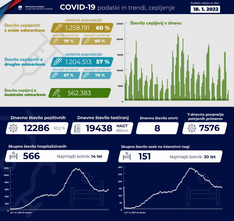V Sloveniji so včeraj, 18. januarja, opravili 19.438 PCR testiranj na koronavirus in potrdili 12.286 novih okužb, gre za 63,2-odstotni delež okužb.