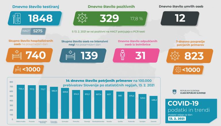 V Sloveniji so včeraj, 13. februarja, opravili 1848 PCR testiranj na koronavirus in potrdili 329 novih okužb, gre za 17,8-odstotni delež okužb.