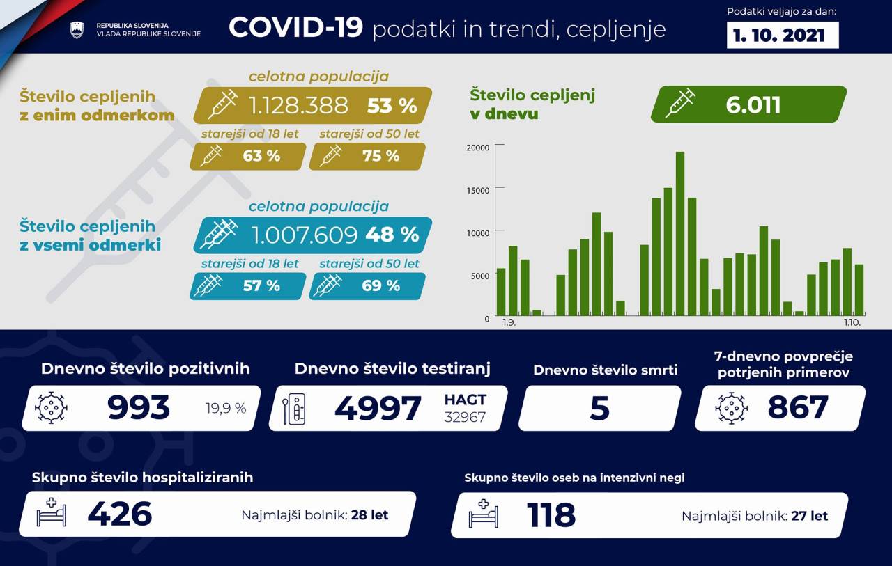 V Sloveniji so včeraj, 1. oktobra, opravili 4997 PCR testiranj na koronavirus in potrdili 993 novih okužb, gre za 19,9-odstotni delež okužb.