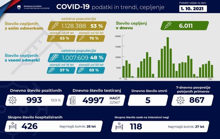 V Sloveniji so včeraj, 1. oktobra, opravili 4997 PCR testiranj na koronavirus in potrdili 993 novih okužb, gre za 19,9-odstotni delež okužb.