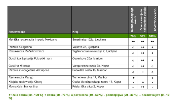 Kot je razvidno iz tabele, so strokovnjaki preverjali Gostilnico & picerijo Pobreški hram, Pizzerio in špageterio Al Capone ter Restavracijo Mango. Pobreški hram je dobil dobro oceno, medtem ko sta jo Al Capone in Mango odnesla s povprečno oceno.