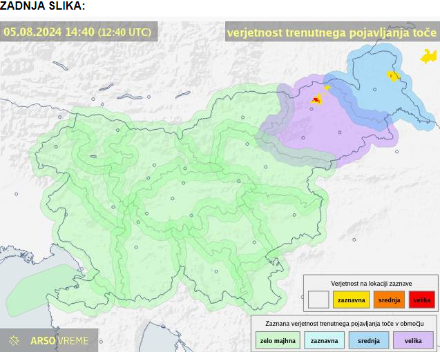 Agencija za okolje je pred nekaj minutami povečala stopnjo nevarnosti toče na območju Podravja na najvišjo možno, ki jo označuje vijolična barva. Prav tako je za območje Pomurja izdano modro opozorilo, ki predstavlja srednjo nevarnost pojavljanja toče.