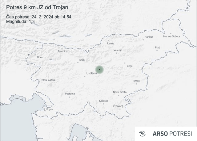 Agencija Republike Slovenije za okolje je sporočila, da so seizmografi državne mreže potresnih opazovalnic ob 14.54 zabeležili potres magnitude 1,3 v bližini Trojan, 23 kilometrov severovzhodno od Ljubljane.