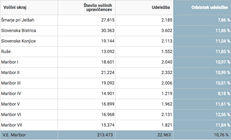 V volilni enoti Maribor je bila volilna udeležba do 11. ure najnižja v Sloveniji, in sicer 10,76-odstotna. Enota z najvišjo udeležbo je Kranj. Tam so zabeležili 13,74-odstotno udeležbo.