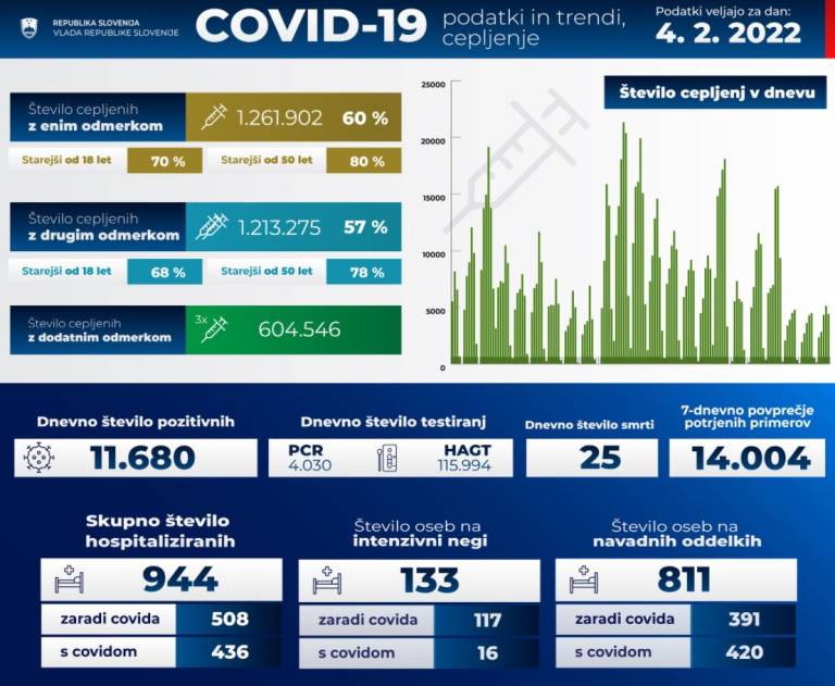 Trenutno je po podatkih Vlade Republike Slovenije v bolnišnicah hospitaliziranih 944 covidnih pacientov, od tega je 133 pacientov na intenzivni negi.