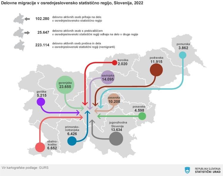 Osrednjeslovenska statistična regija je bila v zadnjih šestih letih edina, ki je imela več delovnih mest kot delovno aktivnih prebivalcev. Lani je ta presežek znašal 32,7 odstotka; to je bilo za desetinko odstotne točke manj kot v letu pred tem. Presežek delovnih mest je bil nazadnje še v obalno-kraški statistični regiji, in sicer leta 2016. Po tem letu pa je prav v tej regiji indeks delovne migracije upadal najintenzivneje med vsemi, in sicer se je v tem obdobju znižal za 5,8 odstotne točke.