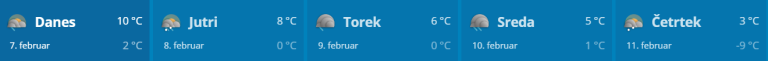 Danes bo večinoma oblačno, nekaj jasnine bo sprva še na vzhodu. Dež se bo čez dan od zahoda razširil na večji del Slovenije, najmanj ga bo v vzhodnih krajih. Pihal bo južni veter, ob morju se bo okrepil jugo. Najvišje dnevne temperature bodo v Gornjesavski dolini okoli štiri, drugod od devet do 15 stopinj Celzija.