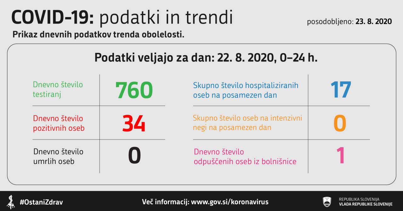 V Sloveniji so včeraj, 22. avgusta, opravili 760 testiranj na novi koronavirus. Potrdili so 34 novih okužb. Za primerjavo. Dan prej so potrdili 43 novih okužb ob 1203 opravljenih testiranjih.