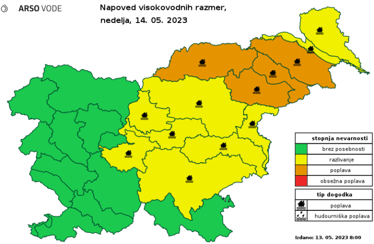 Zaradi povečanih padavin je v vzhodni Sloveniji izdano oranžno opozorilo za poplavljanje rek.